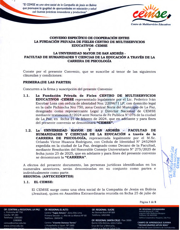CONVENIO MARCO DE COOPERACIÓN INTERINSTITUCIONAL ENTRE LA FUNDACIÓN PRIVADA DE FIELES CENTRO DE MULTISERVICIOS EDUCATIVOS (C.E.M.S.E.) Y LA CARRERA CIENCIAS DEL DESARROLLO DE LA UPEA