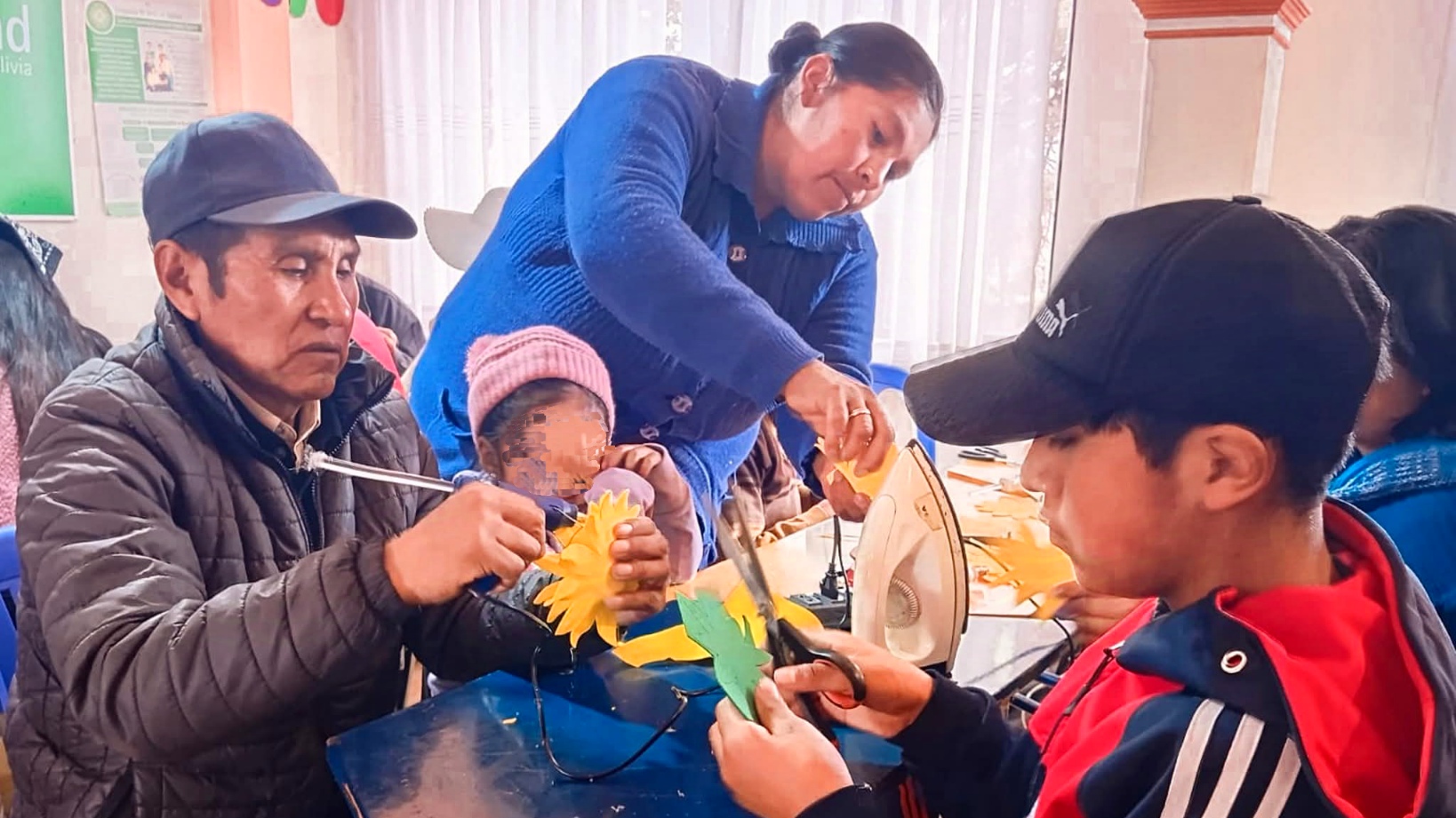 Paralelamente, en el punto de atención Germán Busch 112 se realizaron cursos de cotillonería que destacaron por su creatividad y motivación. Las actividades iniciaron con la elaboración de ramos de flores utilizando limpiapipas, una técnica sencilla que permitió desarrollar la imaginación y la destreza manual de las participantes. Estas dinámicas fomentaron la expresión artística y fortalecieron las redes de apoyo entre las familias involucradas.
