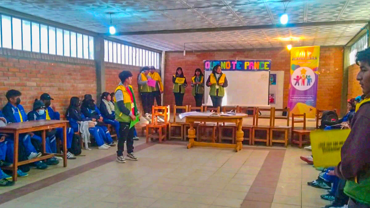 En el marco del programa PACTO de ChildFund – CEMSE, la agrupación juvenil Huayna Wara da continuidad al proyecto denominado “Que no te Pance 2.0” en diversas Unidades Educativas de El Alto, incluyendo las Unidades Educativas Dr. Carlos Montenegro y Gualberto Villarroel B. Esta iniciativa busca concientizar a las y los adolescentes sobre la prevención del embarazo a temprana edad, brindándoles información clara y accesible sobre salud sexual y reproductiva.