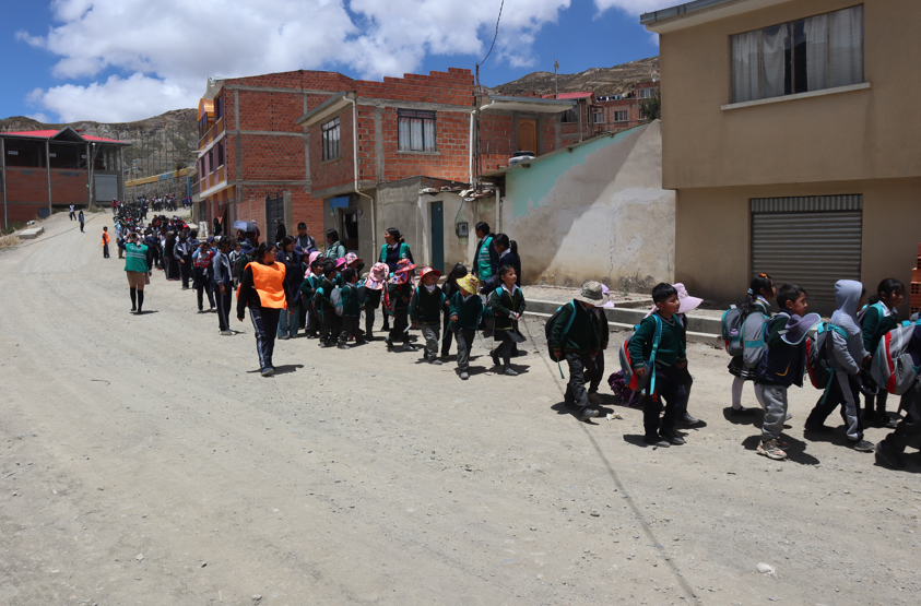 Tras la elaboración de los planes, se llevaron a cabo pre-simulacros de evacuación en caso de incendio, con el fin de evaluar tiempos de respuesta, mejorar la organización y preparar a la comunidad educativa para los simulacros oficiales. Estas actividades contaron con el acompañamiento de la Policía Boliviana y de los centros de salud del municipio, lo que permitió fortalecer la precisión y realismo de los ejercicios.